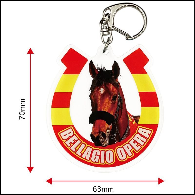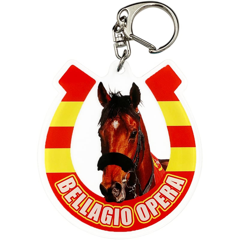 蹄鉄をイメージした勝負服柄の枠に競走馬の肖像を配置したアクリルキーホルダー。